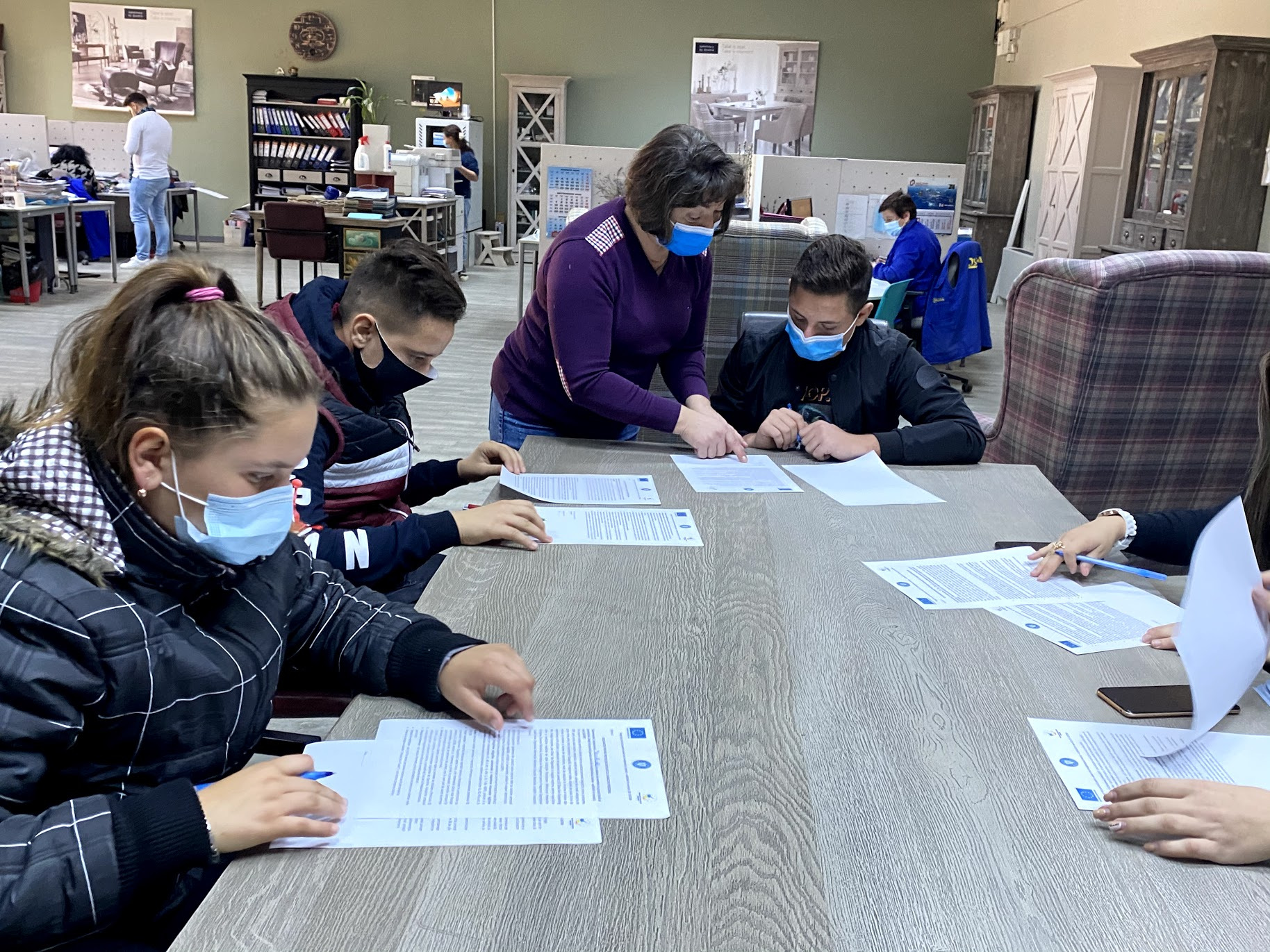 Cei 7 „fantastici„, elevi în clasa a 9-a, învățământ profesional, care se pregătesc pentru calificările „comerciant-vânzător„ și „distribuitor-recepționer„ au avut astăzi ocazia să observe „pe viu„ cum funcționează o unitate al cărui obiect de activitate este producția de mobilă, care sunt departamentele funcționale, ce procese și cum se derulează fluxul tehnologic, cum se face controlul tehnic de calitate, cum se ambalează și cum se distribuie marfa realizată.